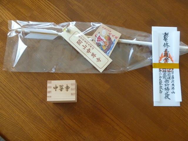 「中尊寺金杯披き」でいただいてきたお札と破魔矢、升。