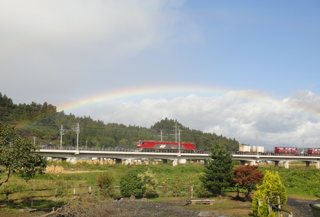コンテナをつけた赤い電車は虹のアーチを行き来して、いまは被災地にたくさんの善意を運んだ帰り道なのかしら、とひとつ童話が生まれそうなお気に入りの写真になりました。