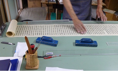 写経用紙をつないでいます。法華経を10本の巻物にしていく最初の作業です。