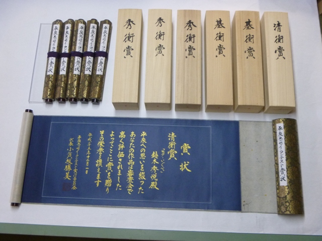 「平泉エッセイ・コンテスト」上位入賞者に贈呈する巻物賞状が出来上がりました。