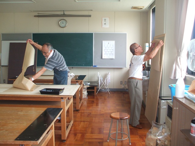 受講生のみなさんの協力で10枚のフスマ紙の張替えができました。写真は新しい下張り紙に糊を付け、張っているところです。