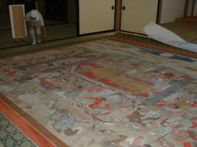 2006年、正法寺の「平成の大改修」の完成に合わせて修理することになり、本堂での作業となりました。小舞台の緞帳のような大掛け軸は、寝かせたら大きな座敷がいっぱいになるほどでした。