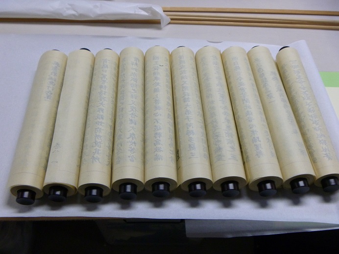一日頓写経会の写経紙が番号順につながり、軸木に巻かれるところまできました。