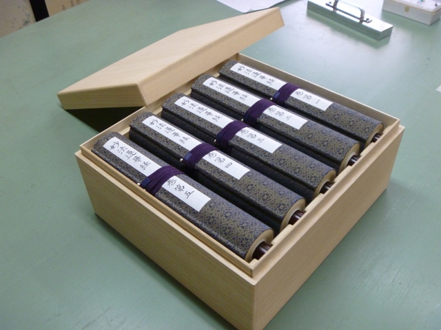 横で作業を眺めているだけの私でしたが、仏に仕える若い和尚さん方の思いが結集したものだ、と思うと胸には熱いものが走りました。こういうだいじなものの表装をさせていただける、というのは表具屋冥利に尽きるなあ、と思った次第です。