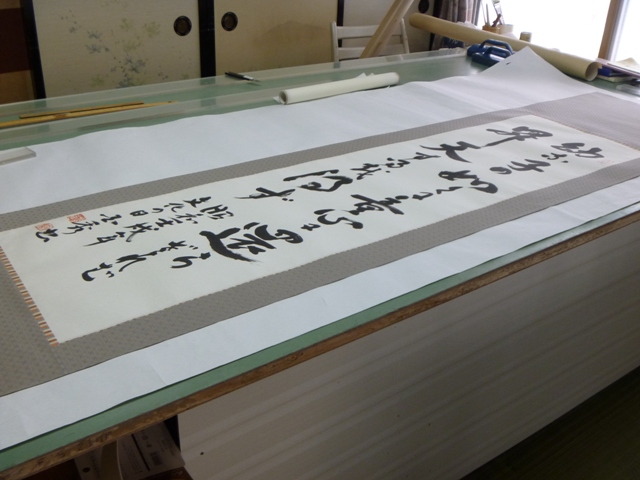 総裏打ちをして、上に八双木と紐、下に軸木を取り付けると出来上がりです。